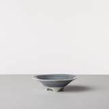 The slightly thick-bodied shape of this three footed bowl exudes warmth with hand-painted lines of varying shade and stress. The face of each dish is beautifully sculpted using the traditional kannabori (鉋彫り) technique, a Japanese form of decorative chattering.